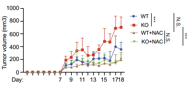 最后,研究者在MC38小鼠皮下荷瘤模型中论证了PRAK缺陷小鼠中Th17的抗氧化应激以及糖酵解的缺陷,将使得Th17细胞介导的抗肿瘤免疫效应显著降低。采用NAC清除ROS可挽救PRAK缺失导致的抗肿瘤效应。