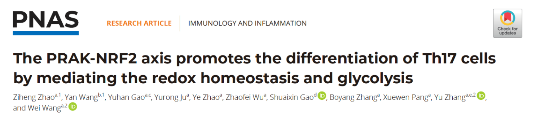 近日,北京大学张毓&王巍团队在PNAS上在线发表了题为“The PRAK-NRF2 axis promotes the differentiation of Th17 cells by mediating the redox homeostasis and glycolysis.”的研究论文。该文章论述了PRAK是Th17中关键的抗氧化应激调节分子,而干预氧化应激可显著改善Th17细胞的糖酵解代谢,提升Th17介导的抗肿瘤免疫。