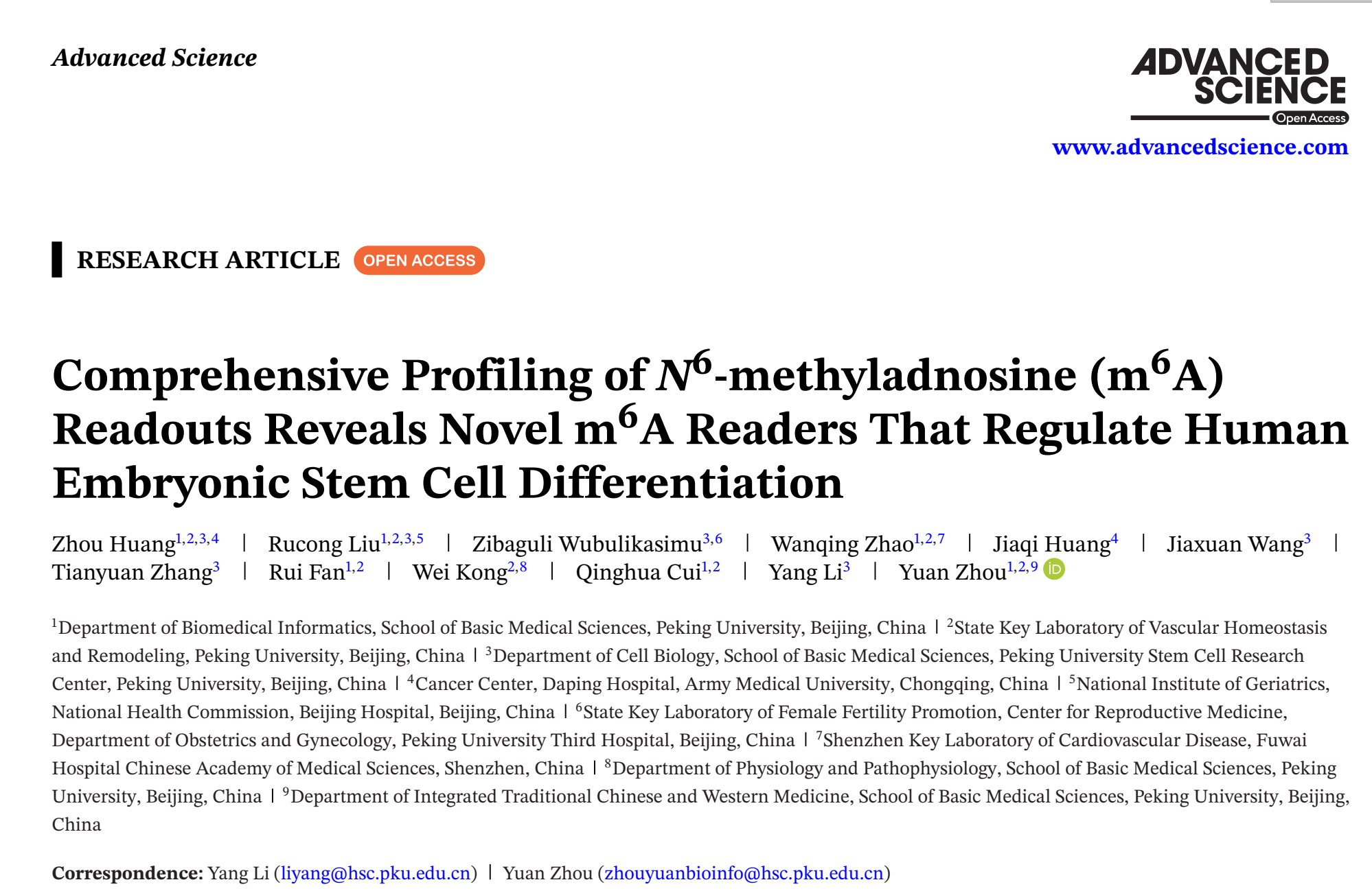2026年1月21日,51直播-51直播网 医学生物信息学系周源研究员与细胞生物学系李扬副教授团队合作在《Advanced Science》杂志上在线发表了一项研究成果——“Comprehensive Profiling of N6-methyladnosine (m6A) Readouts Reveals Novel m6A Readers that Regulate Human Embryonic Stem Cell Differentiation”。