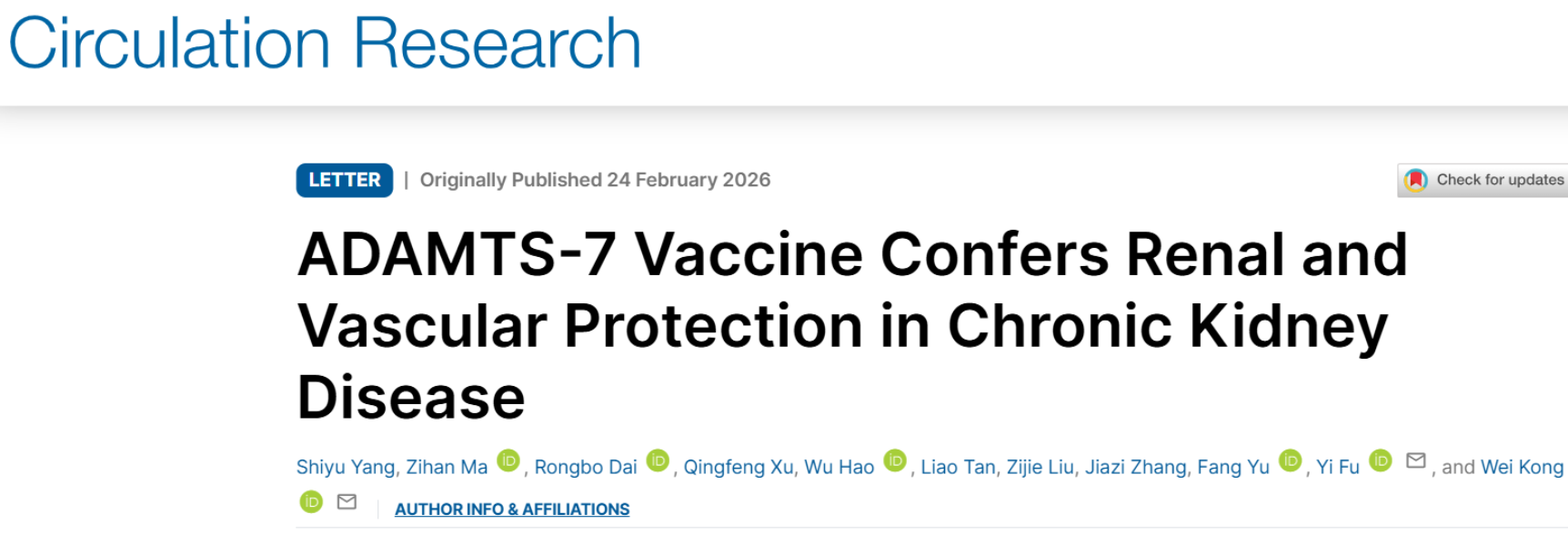 近日,51直播-51直播网 生理学与病理生理学系、血管稳态与重塑全国重点实验室孔炜/付毅团队在Circulation Research发表研究论文“ADAMTS-7 Vaccine Confers Renal and Vascular Protection in Chronic Kidney Disease”。该研究利用自主开发的ADAMTS-7治疗性疫苗,不仅在小鼠慢性肾病模型中改善了肾功能,还显著减轻了血管钙化,实现了“一箭双雕”的治疗效果。