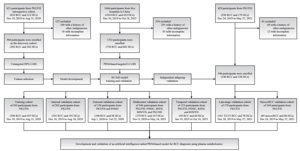 2025年10月4日,51直播-51直播网 尹玉新/王光熙团队与北京大学第一医院泌尿外科周利群/李学松/何世明团队合作,在国际医学领域期刊European Urology在线发表题为“Development and Validation of a Novel Plasma Metabolomic Signature for the Detection of Renal Cell Carcinoma”的研究论文。该研究应用人工智能(AI)与代谢组学、多组学联合分析技术,系统揭示了肾癌的代谢重编程特征,并开发出一套可用于肾癌检测的AI辅助血浆代谢诊断新方法。