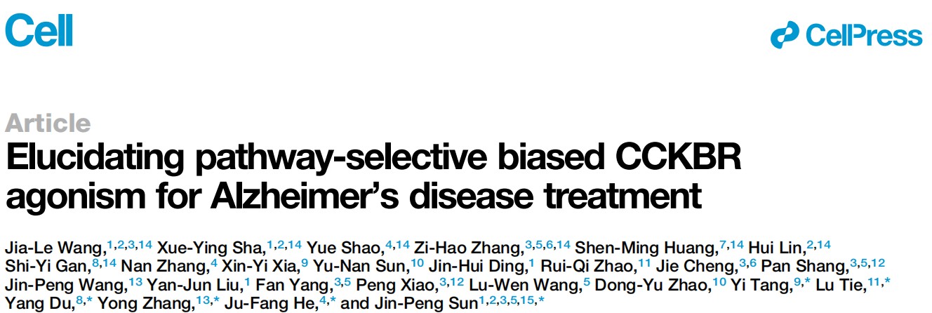 2025年11月21日,北京大学孙金鹏教授与香港城市大学贺菊芳教授,北京大学张勇教授,铁璐副教授,香港中文大学(深圳)杜洋教授,北京宣武医院唐毅主任通力合作,在Cell杂志上发表了题为“Elucidating pathway-selective biased CCKBR agonism for Alzheimer's disease treatment”的研究论文。该研究从临床问题出发,结合临床样本分析与动物模型,系统阐明了CCKBR下游不同G蛋白信号通路在AD进程中的作用;通过解析内源性激动剂CCK8s激活CCKBR不同G蛋白(Gs、Gq、Gi)的分子机制,揭示了其信号偏向性的结构基础,并以此为基础成功设计出具有治疗潜力的Gq偏向性激动剂3r1。进一步通过动物实验与转录组分析,研究团队证实3r1可通过CCKBR-Gq-Plcb4-Adam10信号轴减轻神经/突触损伤、清除Aβ沉积,为阿尔茨海默病的精准治疗提供了全新策略。