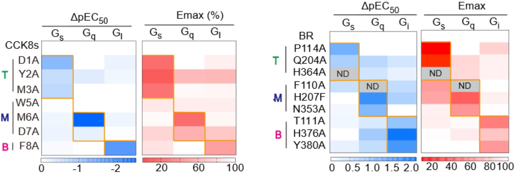 研究团队进一步利用冷冻电镜技术,成功解析了CCK8s与CCKBR及三种不同G蛋白(Gs/Gq/Gi)的复合物结构,发现CCK8s通过受体口袋中不同区域的残基引导特异性G蛋白偶联,其顶部、中部和底部分别主要介导Gs、Gq和Gi信号的传导。