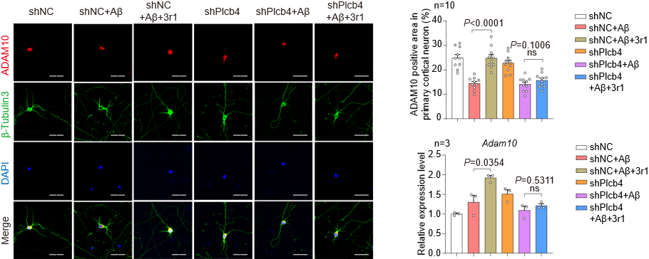 为阐明3r1改善认知功能的具体机制,研究团队通过转录组学分析与体外功能验证,筛选出磷脂酶Cβ4(PLCB4)作为3r1激活CCKBR-Gq信号通路后的关键下游分子。从Aβ代谢通路角度分析,3r1能特异性上调α-分泌酶ADAM10的基因和蛋白表达,并增加其产物sAPPα水平,从而引导淀粉样前体蛋白(APP)向非淀粉样蛋白生成途径加工。在原代神经元中,3r1通过激活CCKBR-Gq通路诱导PLCB4/ADAM10表达上调,进而发挥神经保护作用。这些结果共同确认ADAM10与PLCB4是3r1发挥神经保护作用的关键下游效应分子。