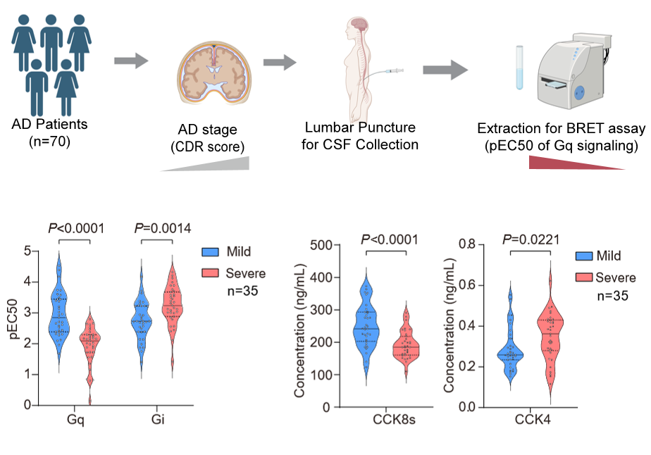 研究团队同时收集了78例处于不同认知阶段的AD患者脑脊液样本,发现重度痴呆患者脑脊液中的多肽成分对CCKBR的Gq信号激活能力明显低于轻度患者,而对Gi信号的激活能力则高于后者。这表明随着AD病情加重,CCKBR的Gq信号活性逐渐下降,而Gi信号活性则呈上升趋势。