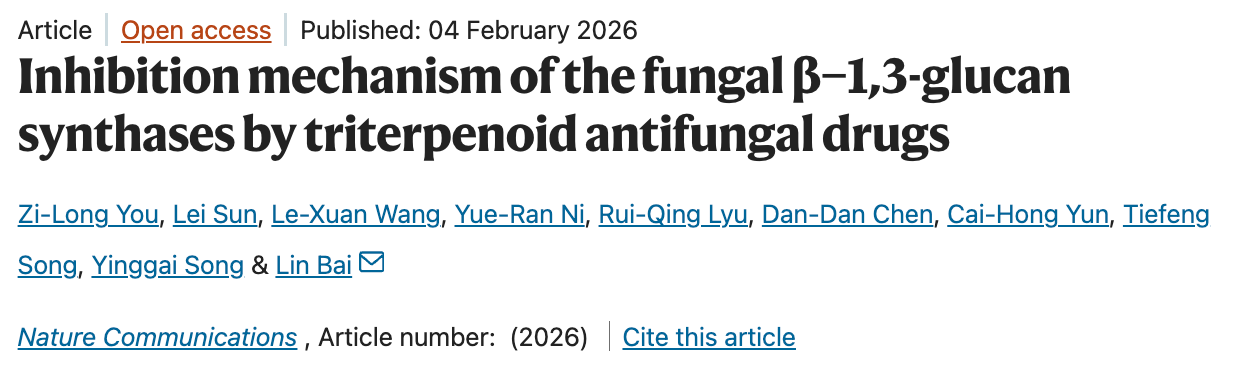 2026年2月4日,51直播-51直播网 柏林课题组在Nature Communications杂志在线发表了题为Inhibition mechanism of the fungal β-1,3-glucan synthases by triterpenoid antifungal drugs的研究论文,系统揭示了三萜类抗真菌药物靶向β-1,3-葡聚糖合成酶的抑制机制,以及临床耐药突变的作用机制,为改造现有抗真菌药物和靶向β-1,3-葡聚糖合成酶的新型药物研发奠定了基础。