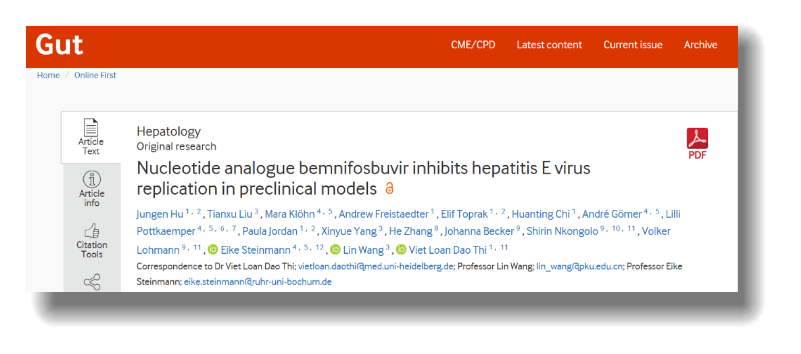 病原生物学系王麟课题组与德国海德堡大学Viet Loan Dao Thi博士团队、德国波鸿鲁尔大学Eike Steinmann教授团队合作,在消化肝病领域学术期刊Gut(IF="26.2)上发表了题为“Nucleotide analogue bemnifosbuvir inhibits hepatitis E virus replication in preclinical models”的研究成果。该研究首先建立了一种全长HEV报告病毒高通量筛选平台,进而发现核苷类似物Bemnifosbuvir(BEM)在HEV感染的多种临床前模型中具有显著的抗病毒效果。BEM是一种靶向病毒RNA依赖的RNA聚合酶(RdRp)的核苷类似物前药,此前已在针对丙型肝炎病毒(HCV)和新型冠状病毒等其他RNA病毒的研究中展现出良好的安全性及抗病毒活性。本研究通过建立高效的药物筛选平台,和多种体外及体内感染模型证实了其对HEV的抑制作用。