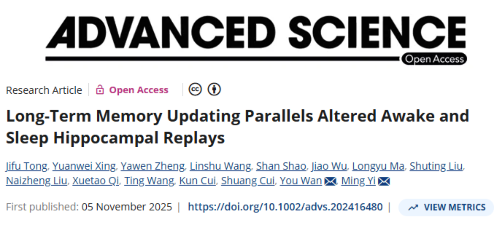 · Advanced Science研究表明,睡眠中的神经远重放是记忆更新的关键机制
