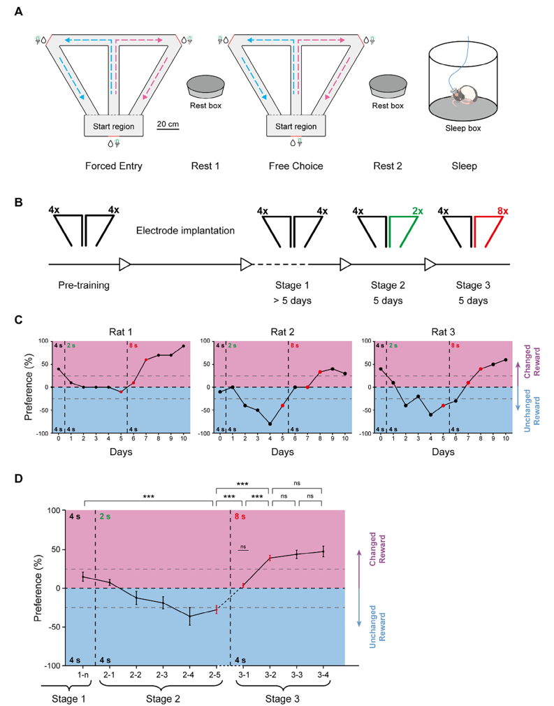 在发表于 Advanced Science 的研究中,研究团队通过构建动态变化奖励的空间任务,揭示了长期空间记忆更新的过程。研究发现,当环境发生改变时,动物不会立即调整行为,而是经历一个关键过渡阶段,其中“偏好丧失阶段”(LOS)是记忆更新真正发生的窗口。