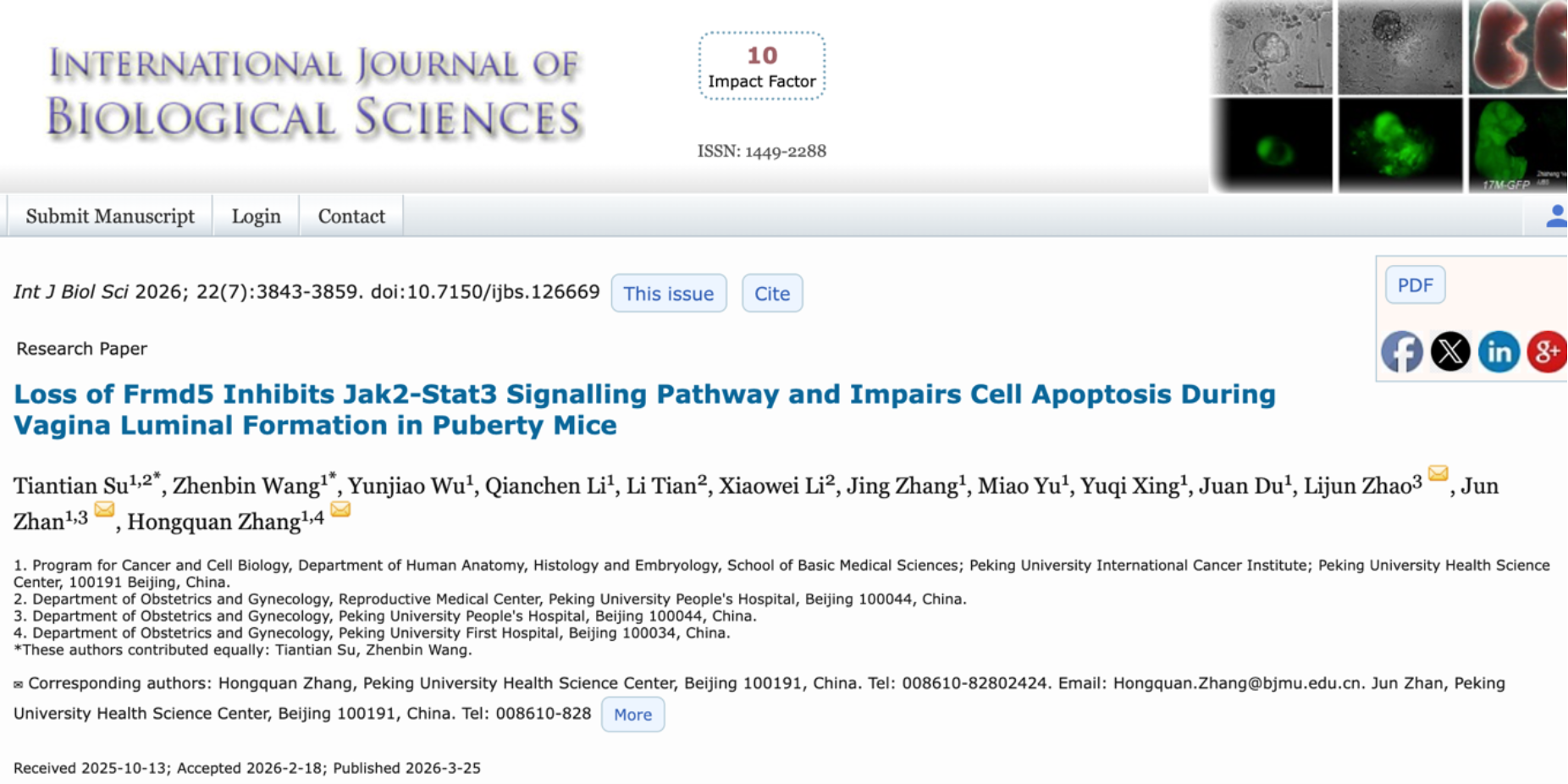 近日,51直播-51直播网 、北京大学国际癌症研究院张宏权教授和战军研究员团队在International Journal of Biological Sciences发表题了为“Loss of Frmd5 Inhibits Jak2-Stat3 Signalling Pathway and Impairs Cell Apoptosis During Vagina Luminal Formation in Puberty Mice”的研究论文。该研究以小鼠为研究模型,揭示了含FERM 结构域蛋白 FRMD5 在雌性生殖道发育中的关键作用:FRMD5 通过激活 Jak2-Stat3 信号通路促进阴道上皮细胞凋亡,参与阴道管腔形成过程,为理解女性生殖道发育异常提供了新的分子机制。