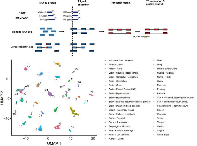 在该工作中,研究者首先通过多种转录组学数据的整合实现了TE起始转录本的准确鉴定。通过对生理条件下TE起始转录本的系统鉴定,这些TE起始转录本不仅呈现出明显的组织特异性表达的特征,且其嵌合表达基因功能显著富集于对应组织的生物学过程。