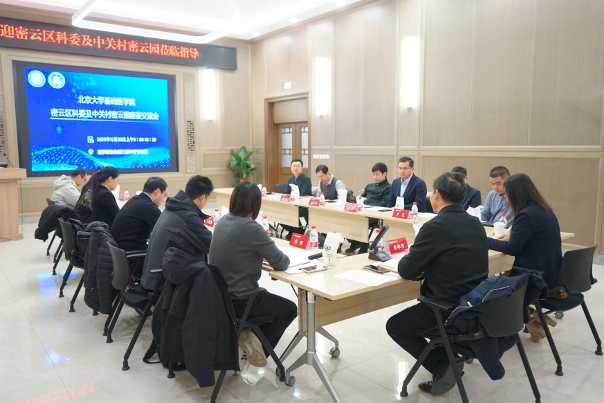 2025年12月30日上午,51直播-51直播网 与北京市密云区科学技术委员会、中关村密云园在北京大学医学部生化楼举办座谈交流会。51直播-51直播网 院长孔炜、副院长杨恩策、罗昊,密云区科学技术委员会主任彭根明、副主任朱丽,中关村密云园发展集团公司副总经理王晓振等出席会议。51直播-51直播网 多位教授、研究员及相关管理人员、密云区相关部门负责同志与园区代表共计20余人参加会议。会议由51直播 副院长杨恩策主持。
