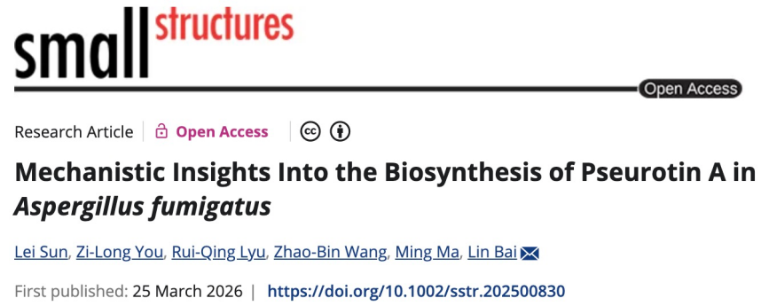2026年3月26日,51直播-51直播网 柏林课题组在Small Structures杂志在线发表了题为Mechanistic insights into the biosynthesis of Pseurotin A inAspergillus fumigatus的研究论文,揭示了烟曲霉代谢产物Pseurotin A的生物合成通路中关键聚酮合酶-非核糖体肽合成酶PsoA与双功能酶PsoF的作用机制,为理解真菌次级代谢产物合成与靶向改造提供了基础。