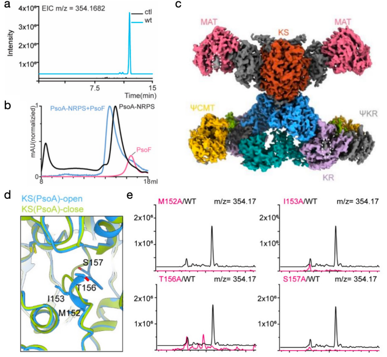 该研究基于Pseurotin A生物合成基因簇与酿酒酵母构建了Pseurotin A的外源代谢产物合成系统(图1a),还通过表达纯化Pseurotin A合成关键催化酶PsoA与PsoF,结合免疫共沉淀、分子排阻色谱、交联质谱等证实PsoF通过FMO结构域与PsoA的NRPS模块直接结合形成复合物发挥功能(图1b)。该研究还利用冷冻电镜解析了PsoA的在Apo状态及与底物结合状态下的高分辨率三维结构(图1c),揭示了PsoA-PKS催化功能的结构基础以及与哺乳动物脂肪酸合成酶FAS的结构保守性。值得注意的是,该研究发现了PsoA酮基合酶结构域(KS)活性位点中存在一个动态环(图1d),其构象变化可调控活性口袋的大小,结合质谱分析推测该区域可能发挥着控制中间产物的甲基化修饰功能(图1e)。这些发现不仅为Pseurotin A生物合成和PKS-NRPS杂合酶的分子机制提供了新的见解,还有助于未来进一步理解烟曲霉感染机制和基于合成生物学策略改造天然产物合成途径。