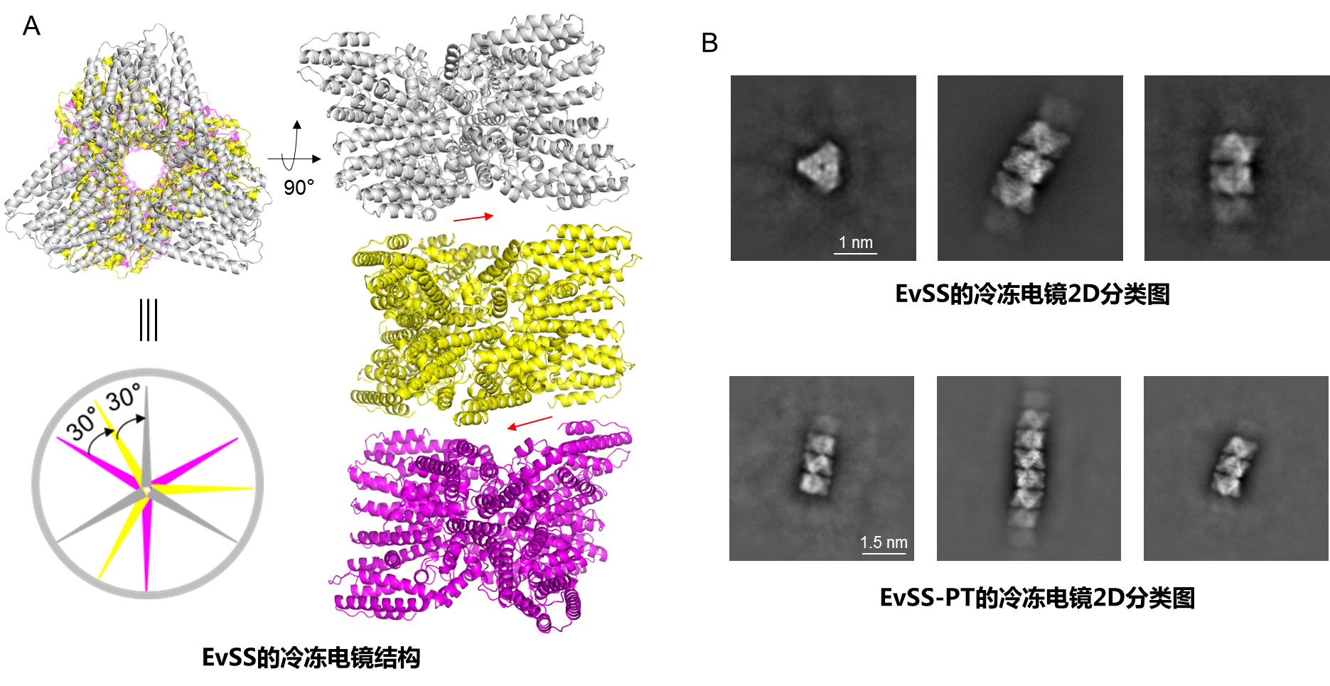 图3EvSS的冷冻电镜结构(A)(以三层PT-六聚体为例展示,从上到下以灰色、黄色、橙红色表示,红色箭头表示两层PT-六聚体之间的间隙),以及EvSS和EvSS-PT冷冻电镜2D分类图(B)