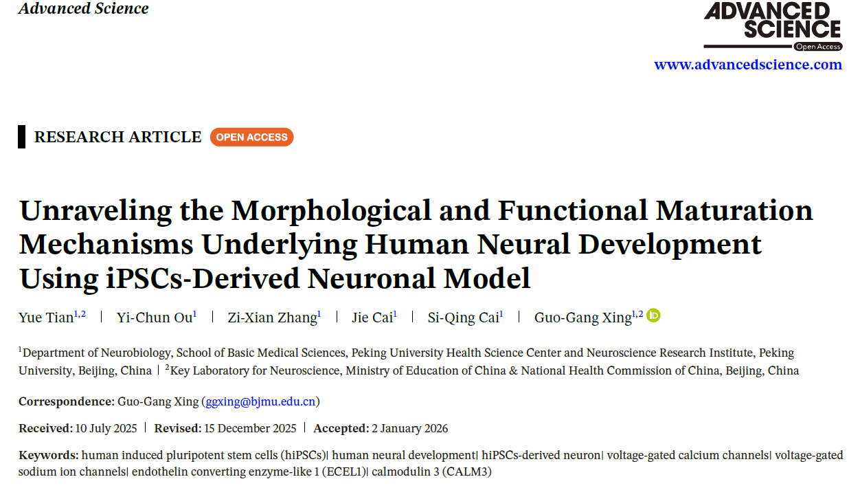 2026年1月12日,51直播-51直播网 神经生物学系邢国刚教授团队在《Advanced Science》杂志上在线发表了一项研究成果——“Unraveling the Morphological and Functional Maturation Mechanisms Underlying Human Neural Development Using iPSCs-derived Neuronal Model”。